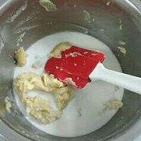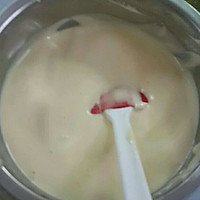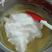 Add 1/3 meringue to the egg yolk paste, stir up and down and mix evenly, (do not stir in circles to avoid egg whites defoaming)