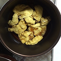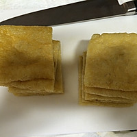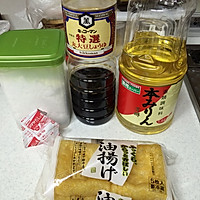 Boil the cut fried tofu in hot water for 2 or 3 minutes, remove the excess fat, remove it, rinse it with water, gently squeeze out the excess water with your hands, and set aside.