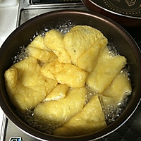 Pour out the previous hot water, pour all the ingredients for cooking fried tofu into the pot, heat it, add fried tofu, cook over low heat until flavorful, drain the soup, and let it dry until warm, then wrap it in sushi rice.