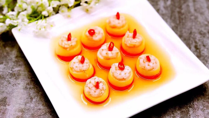 After making a thick state, pour it on the shrimp and egg tofu and garnish with red pepper;