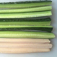 Wash the cucumber and cut it into long strips, and cut the sausage into long strips for later use.