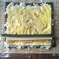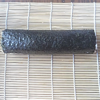 Mix the rice with a little sugar and sushi vinegar and spread it flat on top of the seaweed.