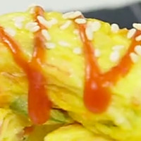 Add the egg juice to the pot in batches, and when the surface is in a half-cooked state that has not yet fully solidified, it should be folded in half and rolled up; Use a brush to smear a little oil in the pot, push the soft-boiled egg to the side with oil, the other side of the pot also smear a little oil, then add the egg juice, first use chopsticks to lift the half-cooked egg, let the newly added egg juice spread in the pot, wait for the half-cooked and then fold the two in half together, and then repeat the above steps until the egg juice is all used up. (Anyway, just keep rolling)