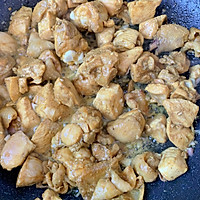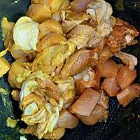 Add oil to the bottom of the pan, pour in the marinated chicken thighs and the remaining chopped onions, and stir-fry until the turmeric is colored.