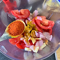 Put the cut tomatoes, onion, garlic, and ginger into a cooking blender, add a spoonful of turmeric powder, half a tablespoon of curry powder, and a spoonful of paprika, and mix with a blender. You can leave some chopped onion for later use.