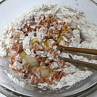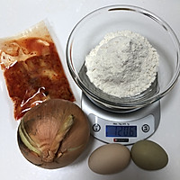Chop the onion, spicy cabbage and put it in the flour Crack in two eggs Add an appropriate amount of water, stir well, the batter should not be too thick or too thin