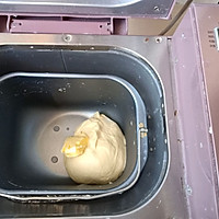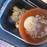 Today I use the water method, which is suitable for making bread in summer, that is, except for butter, yeast, salt, and five percent milk, all other ingredients are kneaded into a ball in a bread machine until there is no dry flour, then cover with plastic wrap and refrigerate for half an hour to take it out, tear the dough into pieces and put it in the bread bucket, dissolve the yeast with ten percent milk and pour it into the bread bucket, and now start the first 20-minute kneading process.