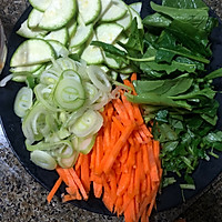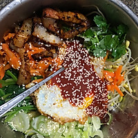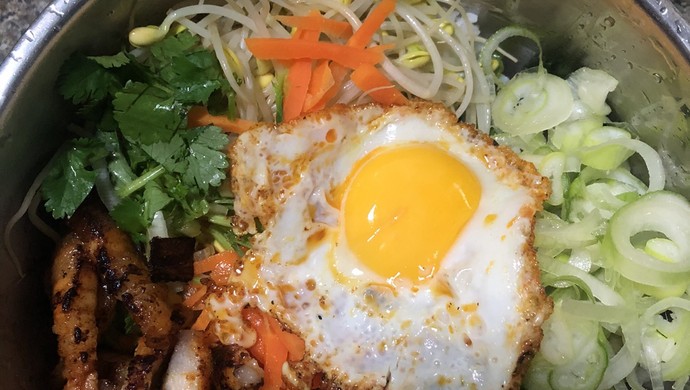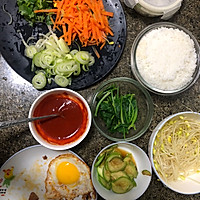 The pork belly is fried, soybean sprouts, spinach, carrots are boiled in boiling water, mushrooms and zucchini are fried, add an appropriate amount of salt and soy sauce. Fry another half-raw omelette with egg yolk