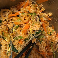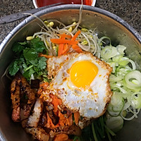 Put rice at the bottom, put all the vegetarian dishes, and I like to mix green onions raw. I love to eat