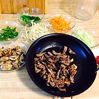 Cucumber, carrot shredded. Slice the mushrooms, cut the meat into strips, add a little sesame oil and soy sauce. Boil water, greens, bean sprouts, carrots, and blanch in a pot. Put a little oil in the pan and fry the meat until cooked. Steam the rice, put it in a bowl, arrange the dishes, add the Korean chili sauce, and stir well.