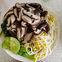 Wash zucchini, shiitake mushrooms, bean sprouts, spinach, shiitake mushrooms, zucchini and spinach and cut into pieces, blanch all these greens, cool and clean the water for later use.