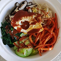 Brush a large bowl with sesame oil, put the cooked rice in a bowl with vegetables, fry an egg and pour the sauce over the rice.