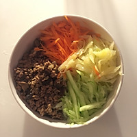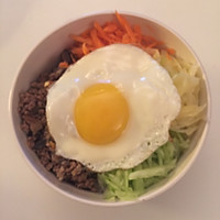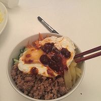 Fry a poached egg on one side, pat the cooked rice in a bowl, not too slowly, spread the minced meat and shredded vegetables on top of the rice, and cover with the egg.