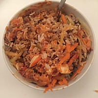 Cook the rice first. Soak the mushrooms and cut them into cubes, stir well with minced meat, ginger paste, and garlic paste, add a tablespoon of soy sauce, a small spoonful of salt, and monosodium glutamate sesame oil to taste. First stir-fry the diced onion, then add the minced meat and stir-fry together, add soy sauce to adjust the color, if the minced meat is too dry, you can put a little water, stir-fry and set aside.