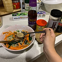 Add a little salt and chicken essence, half a spoonful of white sesame seeds and soy sauce, and two tablespoons of sesame oil