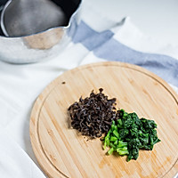 Blanch the spinach and fungus in boiling water, cut the fungus into thin strips, dry the spinach to an operating temperature, pinch off the water with your hands, and cut into 2 cm pieces.