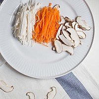 Cut fresh mushrooms into thin slices and set aside; Cut the king oyster mushrooms and carrots into thin strips and set aside.