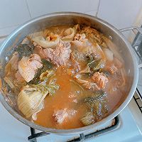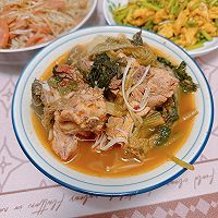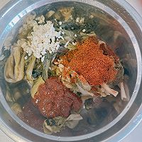 Add the pickled dried cabbage to the spine that is simmered for 30 minutes. Potato chunks, chrysanthemum. Enoki mushroom perilla leaves. Vermicelli. Perilla powder. Cook for 15 minutes.