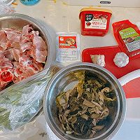 Pig backbone. Enoki mushroom. Cut the potatoes into pieces. Chrysanthemum. Dry wash the cabbage. Scallions. Ginger. Garlic. Wine. Korean miso Korean hot sauce Suzi powder