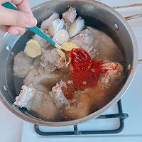 Add green onion, ginger, cooking wine, a tablespoon of Korean miso sauce, and a spoonful of Korean hot sauce and cook for 30 minutes