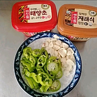 Prepare two types of sauces, hot sauce and miso sauce, this miso I use the kind of sauce I use to make miso soup, it has a natural bean flavor and the hot sauce is very delicious. Of course, you can also use ready-made rice sauce, I prefer to make my own sauce. Slice the garlic and cut the pepper into rings.