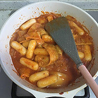 Stir-fry the rice cakes and fish cakes, then add 2 spoons of Korean hot sauce and water and stir-fry