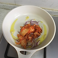 Put oil in a pot and preheat over medium heat, add onions and stir-fry until fragrant, then add kimchi and stir-fry, then add an appropriate amount of sugar (I don’t like kimchi to be too sour, so I will add sugar, you can also add it without adding)