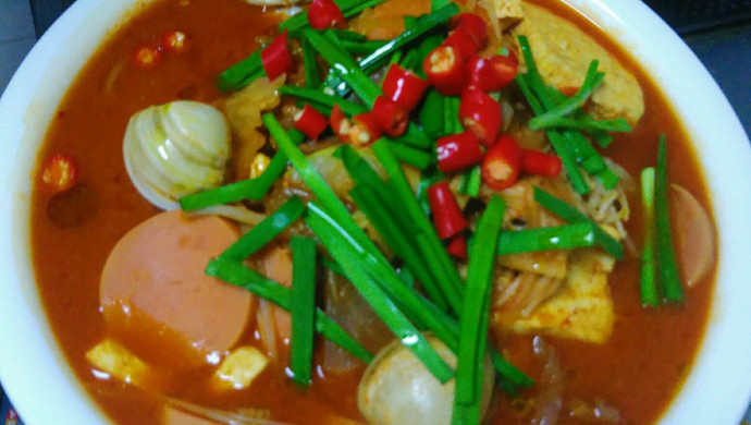 Rice water is heated until it boils. Add the hot sauce sauce, stir well, and add the beef after opening the pan. Then put in turn, white radish, tofu, onion, zucchini, king oyster mushroom, enoki mushroom, bean sprouts, and continue to cook for ten minutes after boiling. Finally, add the clams, cook for two minutes, and turn off the heat when you open your mouth. Garnish with leeks and millet spicy rings.