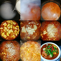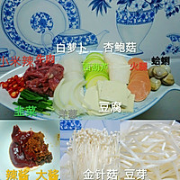 Rice water is heated until it boils. Add the hot sauce sauce, stir well, and add the beef after opening the pan. Then put in turn, white radish, tofu, onion, zucchini, king oyster mushroom, enoki mushroom, bean sprouts, and continue to cook for ten minutes after boiling. Finally, add the clams, cook for two minutes, and turn off the heat when you open your mouth. Garnish with leeks and millet spicy rings.