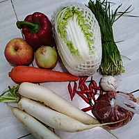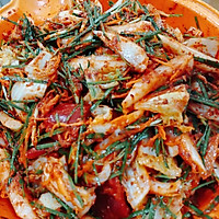 After washing the cabbage, knead the salt and remove the water, pay attention to smearing the salt layer by layer, cut the white radish into strips, shred the carrots, cut the leeks into sections, shred the onion, mix with salt and remove the water, and let stand for 30 minutes