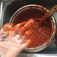 Spread the marinade evenly on each Chinese cabbage leaf with gloves, and rub it on each side