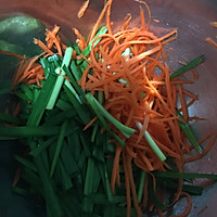 Then add the prepared shredded leeks, carrots and stir well. It is best to stir well in a large basin.