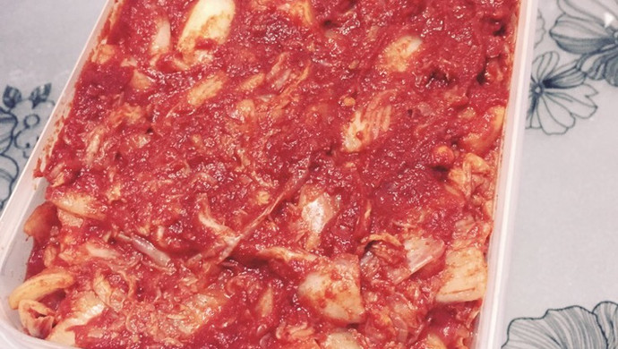 Finally, stir the pickled cabbage and onion well, sprinkle with the finished kimchi sauce, stir well, leave at room temperature for 1-2 days, and then put it in the refrigerator for about two days before eating, if you want to be more sour, you can put it for a few more days