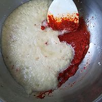 First, blanch the boiled glutinous rice flour with chili powder, and then stir the beaten ingredient puree and chili powder together