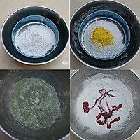 To make muffins of four different colors, so divide them into four different colors of glutinous rice flour. One is pure glutinous rice flour, the second is glutinous rice flour plus 2 spoons of pumpkin powder, the third is glutinous rice flour plus 2 tablespoons of wormwood powder, and the fourth is glutinous rice flour plus 2 spoons of Schisandra extraction. All powders need to be filtered under the filter, and the filtered powder will be more delicate.