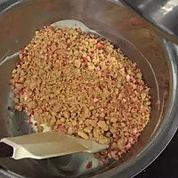 Recombining the base: Melt the white chocolate, mix the pine butterflakes with strawberry crumbs and pour into the chocolate and stir well.