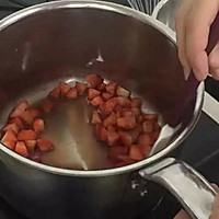 Pomegranate Strawberry Cooley: Pomegranate puree and diced strawberries cook together to more than 40 degrees, quickly pour in sugar and NH pectin, stir well quickly with a whisk, then change to a silicone spatula and stir in an N-shape until boiling.