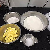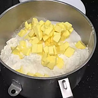 Crispy pine nuts: Dice the refrigerated butter, sift the low flour, weigh the caster sugar and salt separately and set aside.