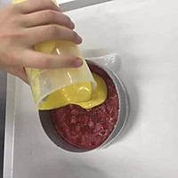 Take out the prepared filling in advance and put it into the mousse, rotate it into the mold to avoid pores, press it until it is level with the mousse paste, and then add a little mousse paste to cover the filling