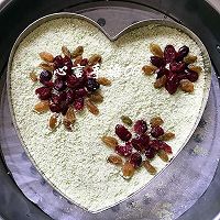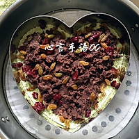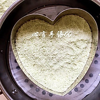 Add water to the steamer, line the steamer with oil paper, put an eight-inch heart-shaped mousse ring, and then loosely spread half of the muffin powder, do not press it with your hands.