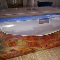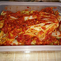 The prepared chili sauce is evenly spread on the pickled cabbage with dry moisture, and it can be put into a sealed box (dry the water in the sealed box beforehand)