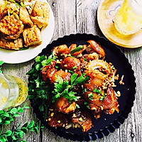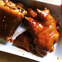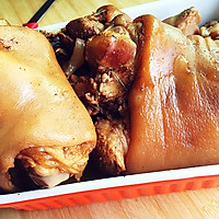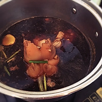 Heat the water in another pot, add five-spice powder, dark soy sauce, rock sugar, green onion and ginger, star anise, cook for a while and add the cooked pig’s trotters. Simmer for 2~3 hours.