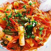 1. Cut the onion and carrot into thin strips and set aside. 2. Prepare semi-finished finger-shaped rice cake strips and Korean hot sauce packets. 3. Boil a large pot of water over high heat, add rice cake strips when boiling; Reduce heat to medium-low heat and bring to a boil again, add a small amount of cold water. 4. Cook three times until all the rice cake strips float and turn off the heat. 5. Use a slotted spoon to scoop up the rice cakes and put them in a draining basket. 6. Rinse the rice cakes with cold water, rinse until they are not sticky and non-sticky, then drain the water and set aside. 7. Pour a little oil into the pan, add shredded onions and carrots, add a little salt to taste, and stir-fry until the vegetables are soft. 8. Pour the cooked rice cake strips into the pan and add the hot sauce. 9. Add an appropriate amount of water and stir-fry the rice cakes and shredded vegetables evenly. 10. When the rice cakes have collected juice until thick, turn off the heat and take it out of the pot. 11. Put the fried Korean spicy rice cakes on a plate and eat them beautifully! (Note: Chopped green onions can be added ^_^ according to personal preference)