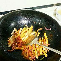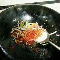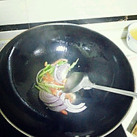 Put oil in a pot, add onions, green peppers, and red peppers and stir-fry