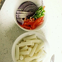 Shred the green peppers, red peppers, and onions, and set aside the rice cakes in strips
