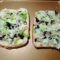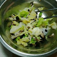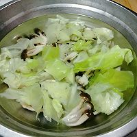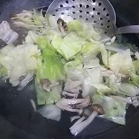 Boil water in a wok and add cabbage and crab-flavored mushrooms and cook for 1 minute