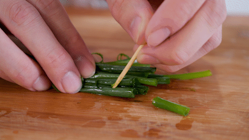 Cut half of the chives into shreds, half into sections, scrape from the middle with a toothpick to make the appearance of chopped green onions! Cut the bell pepper into shreds, cut the ginger into slices and set aside