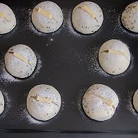 After one hour of fermentation, sprinkle a little high-gluten flour on the surface of the dough for decoration, use a sharp blade to make a deep cut on the surface, and then cut the butter into small strips and clip them into the cut.