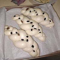 The proofed dough is sprinkled with raisins, squeezed with chipotle sauce and finished with nuts.
