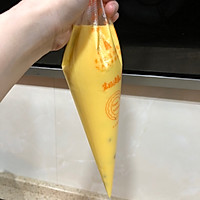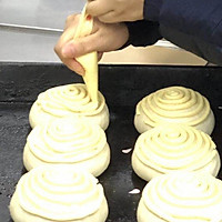 After the dough is ready, take it out of the oven, cut a small opening for the piping bag head (note that the cut mouth is about 3mm) and squeeze the Mexican paste into the bread in a circular motion.